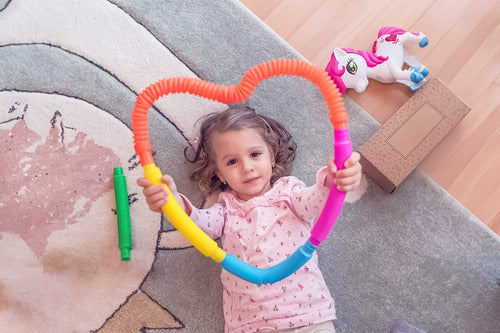 Con colores vibrantes y un tacto suave, este juguete brinda una experiencia multisensorial que contribuye al desarrollo cognitivo y motor de manera divertida. Los niños pueden estirarlo, comprimirlo y crear figuras al poder unirlo con otros tubos, estimulando así la coordinación mano-ojo y la destreza manual.